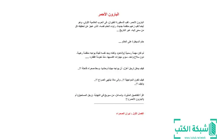 تحميل كتاب البارون الأحمر رجل المستحيل PDF – نبيل فاروق – رواية "البارون الأحمر رجل المستحيل" للكاتب نبيل فاروق تقدم قصة مشوقة تدور أحداثها في إطار الحرب العالمية الأولى حيث يظهر البارون الأحمر كرمز أسطوري للطيران في تلك الحقبة. يتناول العمل شخصية أدهم الذي لم تكن مهمته رسمية لكنه يجد نفسه فجأة في مواجهة منظمة سرية تهدف إلى السيطرة على العالم، وهو الحلم الذي ظل يراوده الكثيرون عبر التاريخ دون أن ينجحوا في تحقيقه.